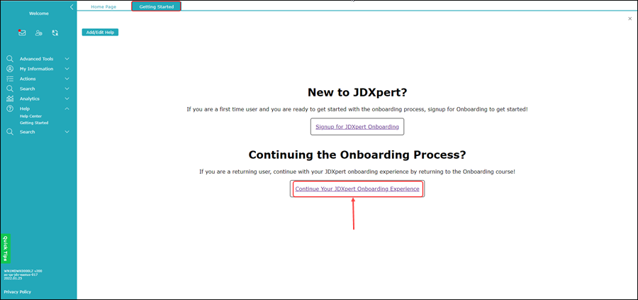 1. Click Continue Your JDXpert Onboarding Experience as shown: