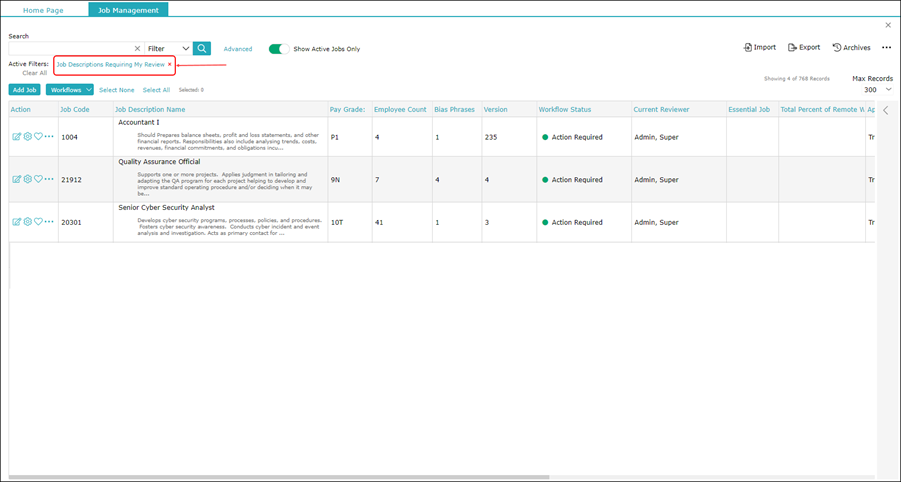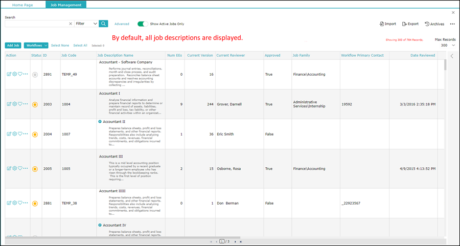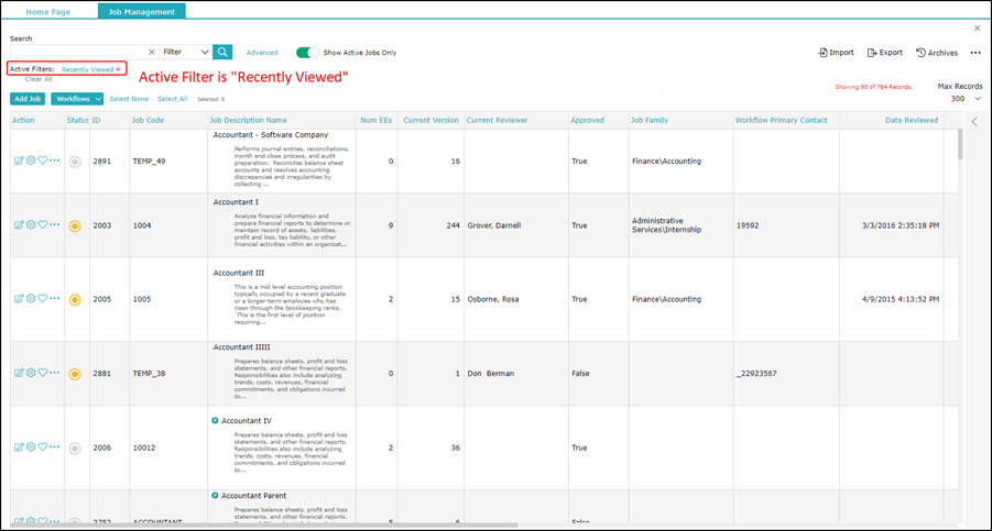 This displays all job descriptions (as per the new filter).