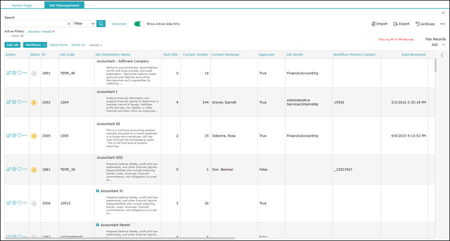 In this example, the AllJobDescriptions filter is selected. This displays all jobs in the Job Management tab.