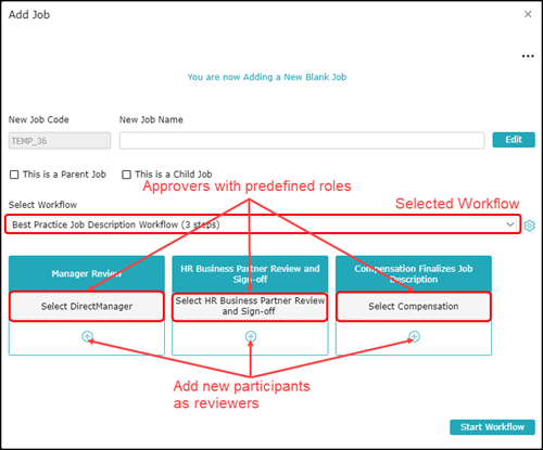 Job workflows allow multiple participants to add or revise job descriptions using a workflow profile. The steps and participants are configurable in the workflow profiles.