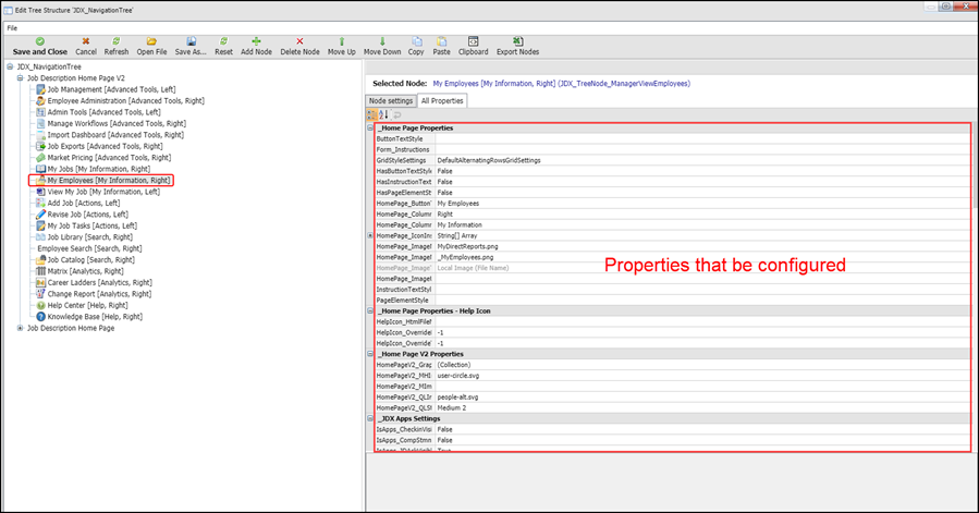 The features in the My Employee tab are configured in the All Properties tab as shown