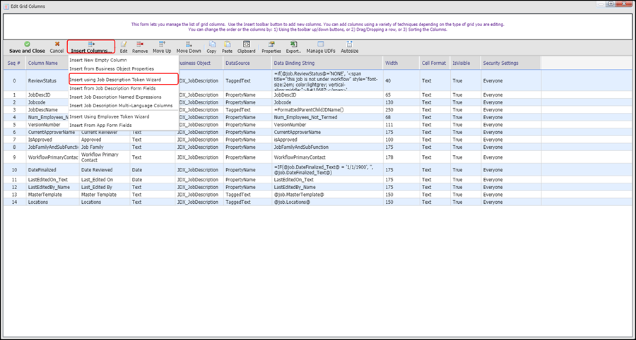 4. Click Insert Columns, and select Insert using Job Description Token Wizard.
