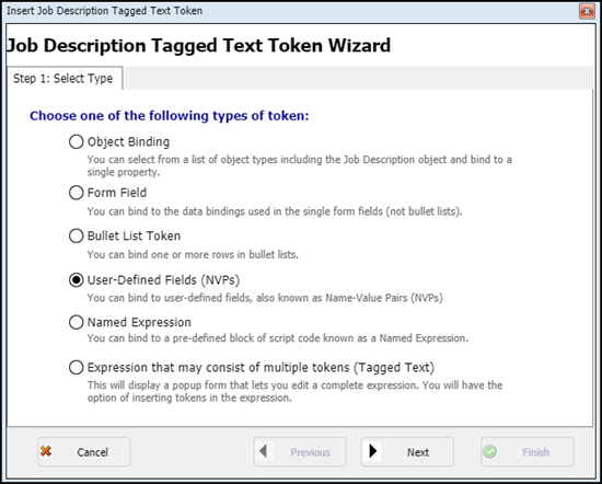 This displays the Job Description Tagged Text Token Wizard.