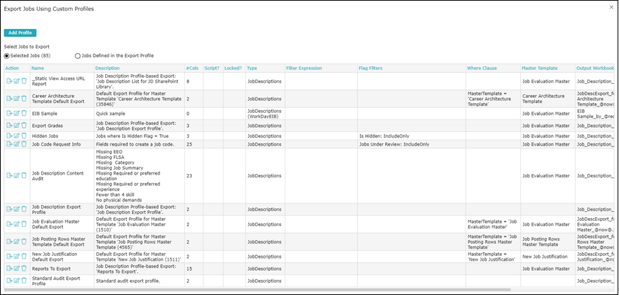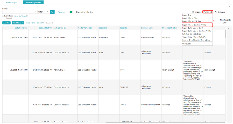 2. Click Export, and then select Export Jobs to Excel via Profile.