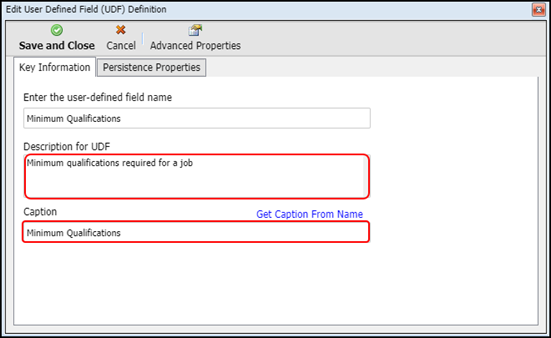 5. Enter the details in the Description for UDF and Caption boxes.