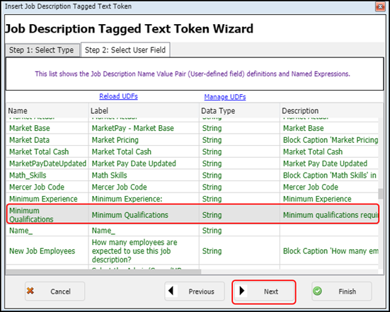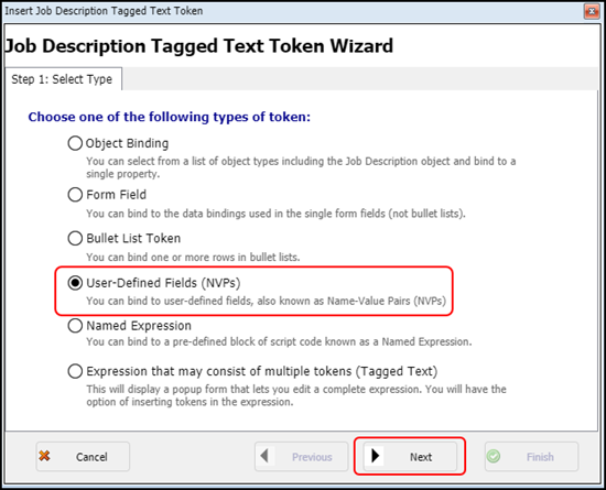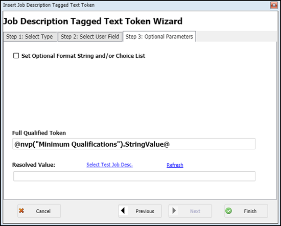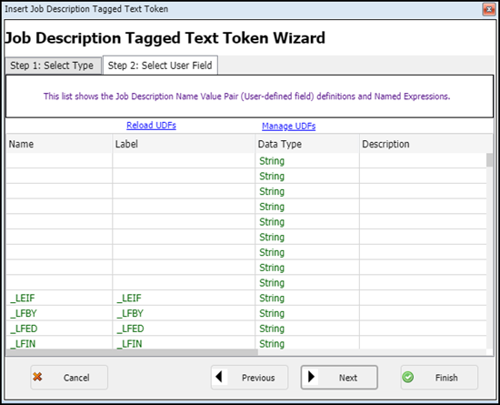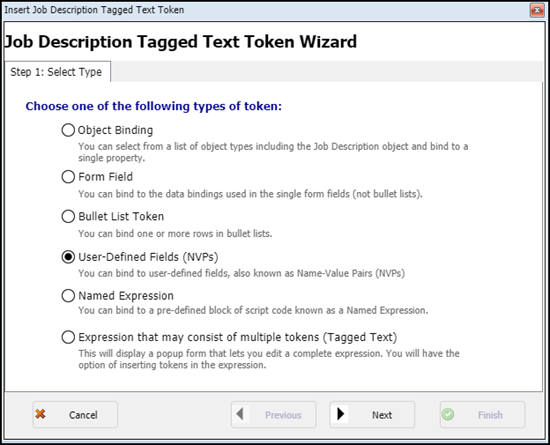 This displays the Job Description Tagged Text Token Wizard screen.