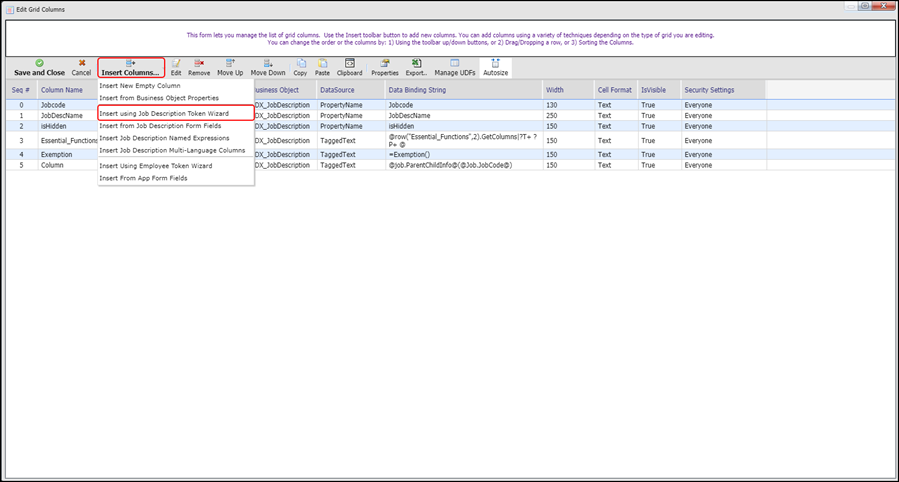 2. Click Insert Columns and select Insert using Job Description Token Wizard.