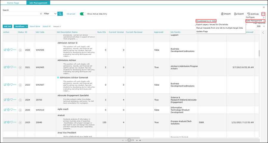 2. Click More, point to Data Management, and select Housekeeping on Jobs.