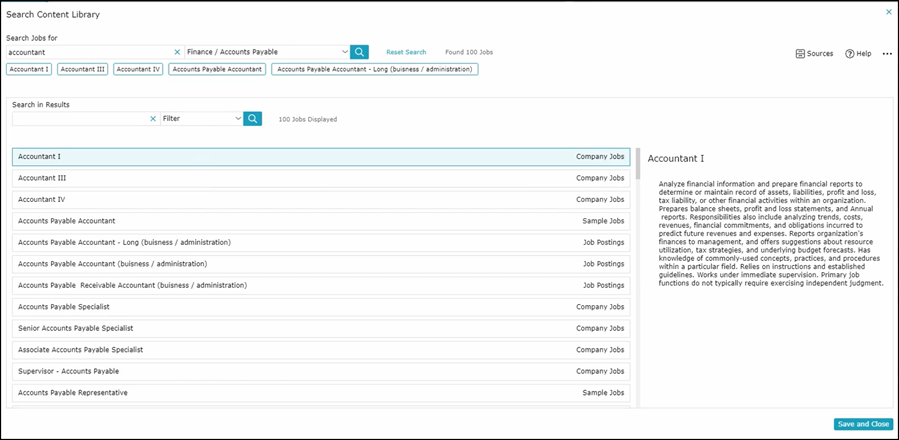 In this example searching for “Accountant”, you can see 85 jobs displayed that contain the word “Accountant.” From here, you can perform some more filtering such as choosing a job family and sub function. Here, we will select the Finance job and the Accounts Payable sub function. This yields 100 results. Choosing the Accounts Payable Accountant job from the list, you will see the job summary on the right. Click Save and Close to choose that specific job.