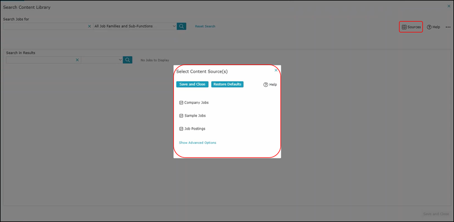 You can control what sources you are pulling into the job description by clicking Sources. Here, we are choosing to pull in jobs from our own Company Jobs, Sample Jobs populated by JDXpert, and Job Postings from the web.