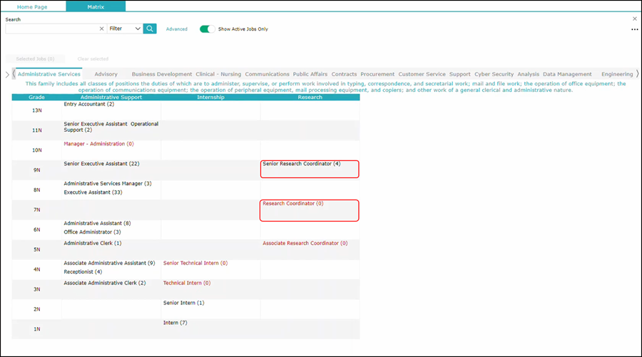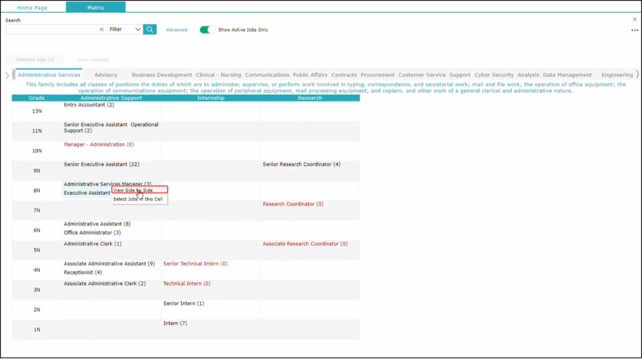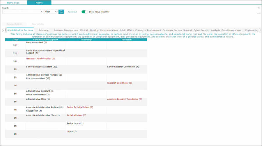 In the example here (and the default view), job family is broken down into individual tabs, the sub families are the sub tabs, and on the left column you'll see that a listing of pay grades. Your system is customizable so that this column is editable to be any other field that you would like. For example, you could use Department Division, Business Unit, Job Level, etc. You will notice the numbers next to each job description name as well as the color differential: the red values represent jobs that do not have any employees attached to them; those in the the darker color represent jobs that do have incumbent employees, indicating the number of employees attached to that particular job.