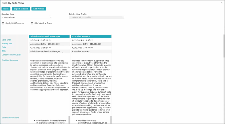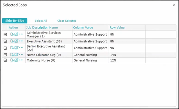 When you view them in side-by-side, you can highlight differences and hide identical rows. If there are more than two jobs in a particular cell, you could select which one you wish to include. You can also select jobs from different job families. For example, if we choose Nursing, you will see all nursing jobs added to this Side-by-Side selection. By referring to icons found in the Action column, you can Preview the job, Edit the job directly which can be restricted based on the user’s role, and the ability to see the number of employees attached to these jobs.