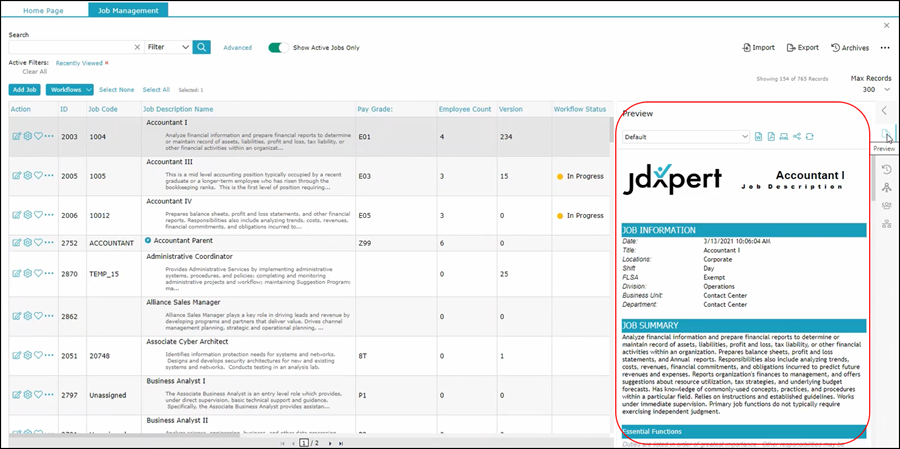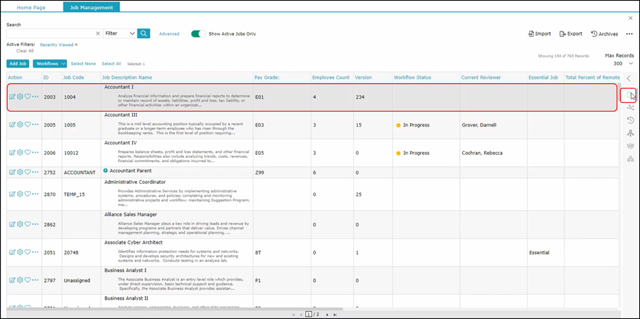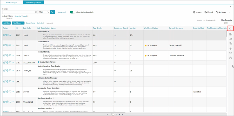 This is the panel in the V1 that provided you quick access to information about the selected job description on the right side of the screen. This feature still exists, however, it is now collapsible to provide you with more landscape to work on your job descriptions in the grid. The collapsible panel is still located on the right side of the grid and contains icons for each of the same functions that you had in V1. Hovering over each icon will display the name of each function in the menu. When you click on the icon,
