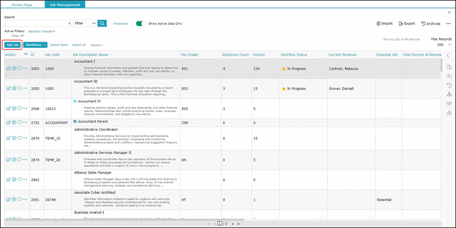 Within Job Management, you have the ability to add a new job description without the use of a workflow. To begin, click on the Add Job button located just above the Action column in your grid.