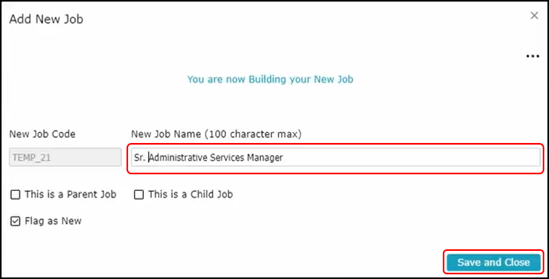 You will now need to provide a new job description to name for your job. Once you provided a new job name, if the job is a parent or a child job, select This is a Parent Job, This is a Child Job. If neither is selected, the job will be flagged as an independent job. Save and Close to continue to make edits to the new job description.