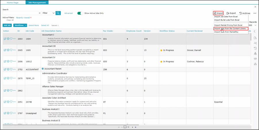 To import complete job descriptions from the content library, begin by selecting the Import option followed by Import Jobs from the Content Library.