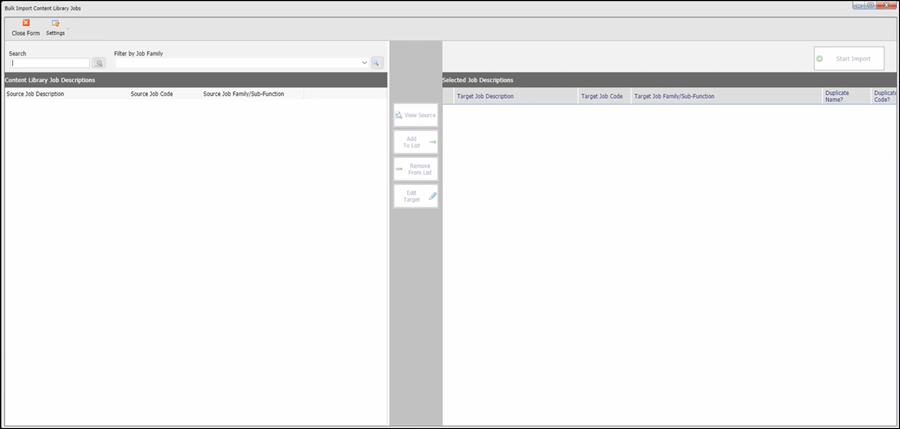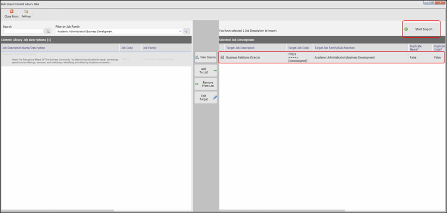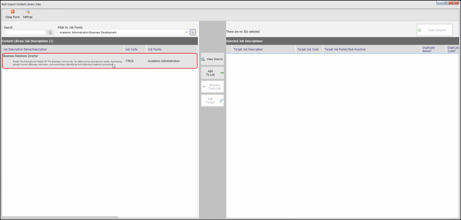 If this is a job description that you would like to add to your own library, click on Add Job Description to Download List. Once the job description has been added to your import list on the right side, click on Start Import.