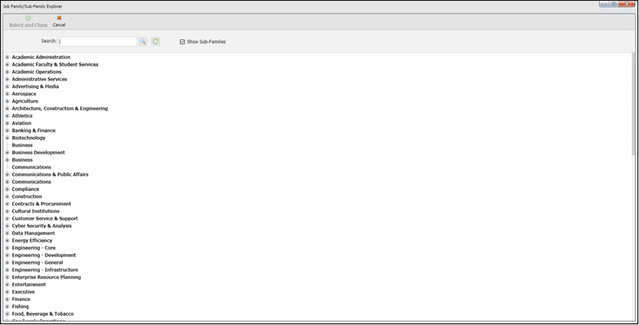 Click on the drop-down to see a full list of job families and sub families. You can also click on the magnifying glass to bring up the job family, sub family explorer view.