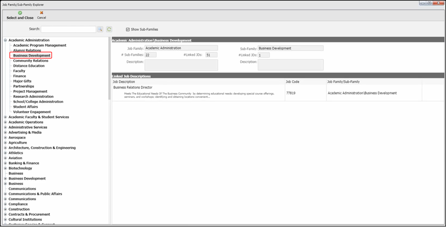 Expand the tree view to see a list of sub families associated with the job family selected. Make a selection of sub family to see a list of job descriptions along with its job summary appear.