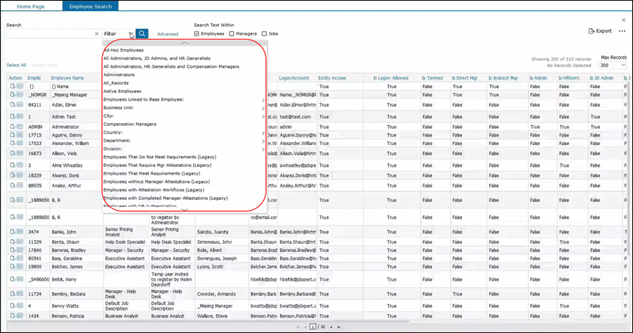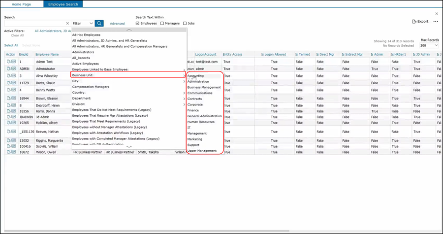 So, if you were to select Ad-Hoc Employees and then select All Administrators, there are no job descriptions that show up. But, if we remove the Ad-Hoc Employees, it will then show the administrators. The filters also have sub-filters. As you can see, employees linked to base employees, we have one. If we were looking at the Business Unit, we could select what business unit we would like to filter for.