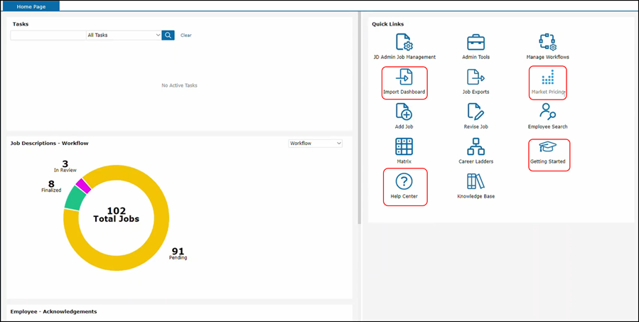 Please view the tutorial for the MarketPay course for more detailed information on this functionality. By clicking the icon, we can see the landing page where you can view and manage your market pricing records for your job descriptions. Back out on the Home Page dashboard, you can access Getting Started either via the Help menu section on the left panel or, if you have it saved as a Quick Link, you can click the icon.