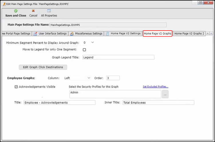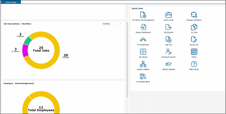 These graphs offer a visual of your job description or employee acknowledgement activity. If you want to edit what is relevant for you, click on the Tools icon at the top of your Home Page dashboard, click Edit Main Page Setting/Logo and choose the Home Page V2 Graphs tab.