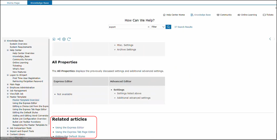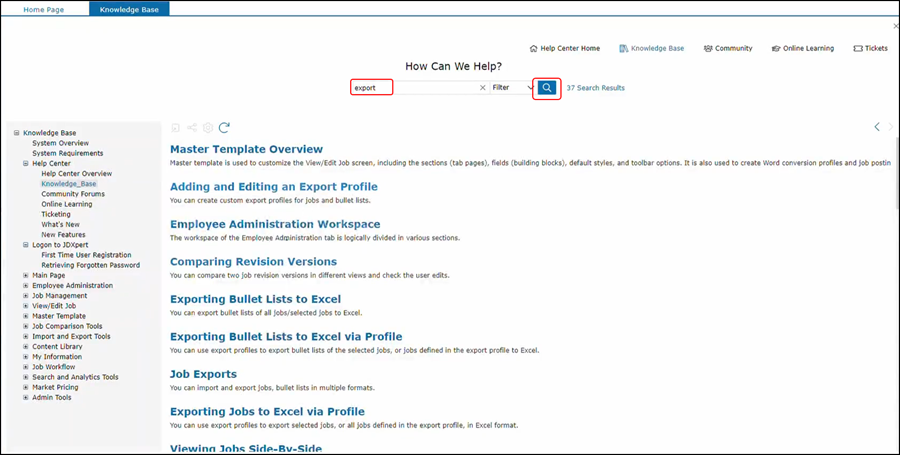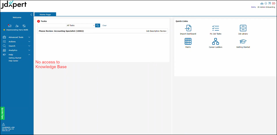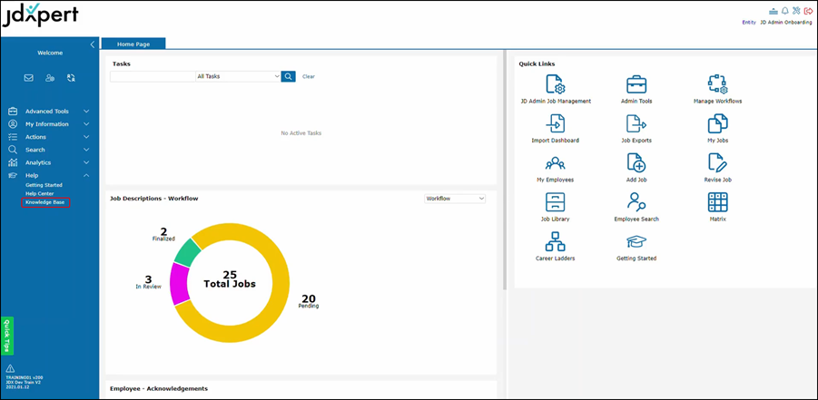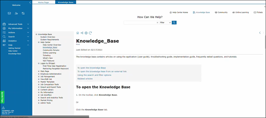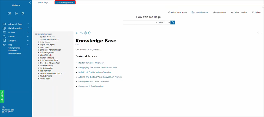 Now we're going to take a look at the Knowledge Base. System administrators, JD admins, and compensation manager have access to Knowledge Base.