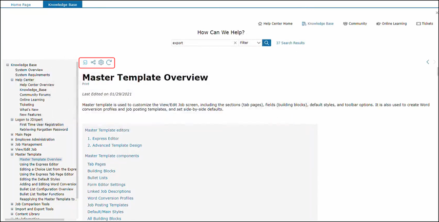 The Knowledge Base has been upgraded into an easy-to-use and intuitive format. The Knowledge Base contains articles, JDX Troubleshooting Guide, an Implementation Guide, FAQs, and tutorials. If you have a how-to question or just want to explore the functionality of your JDX system, Knowledge Base is a great first stop to getting what you need to help you at any time. Besides being used for articles, the Knowledge Base now includes a Glossary, textual-based user documentation that corresponds to the onboarding and level training, will continue to grow as our training library continues to develop. Selecting Knowledge Base from the Knowledge Base icon or the Help Center brings you to the Knowledge Base landing page. To see a list of all articles available, you can expand the tree menu on the left pane and can click on the topic in the tree menu to view the article in the right pane.