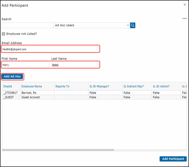We begin by entering the email address and first and last name of the manager we wish to use. Since we don't have managers loaded in the system, we will need to use an email address so they receive a link that can allow them to access the job description via email. After we enter the manager’s information, we can add them as an ad hoc reviewer. Once we do this, click on the Add Ad Hoc button.