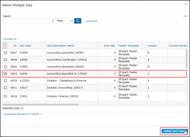 If you're choosing more than one job description, please keep in mind that the reviewers must be the same for all jobs. Here you may search for job descriptions by name or job code or by using one of the filters for this purpose. Here let's go ahead and select our Accounting Specialist II. Select and close.