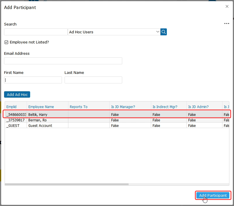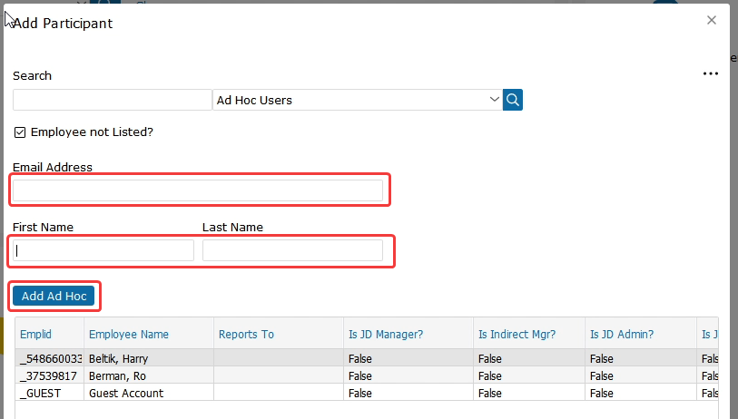 If the manager is not already in the system, you would need to type in their Email Address, First Name, Last Name and then Add Ad Hoc.