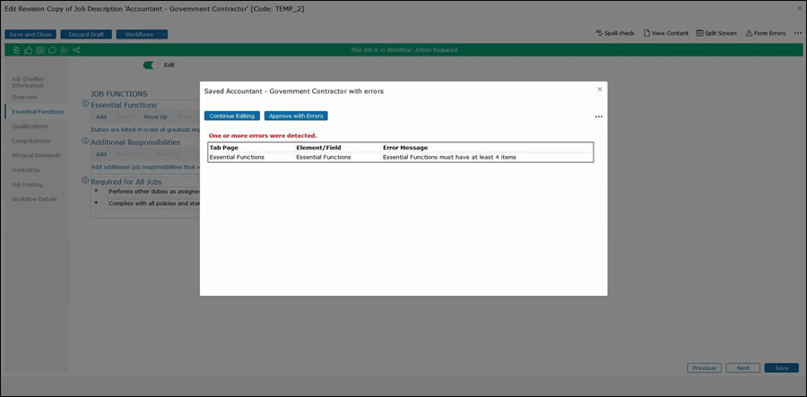 Right now we see that essential functions must have at least four items. Harry does have the ability to Approve with Errors, but it is highly suggested that they click on Continue Editing to fix this issue.