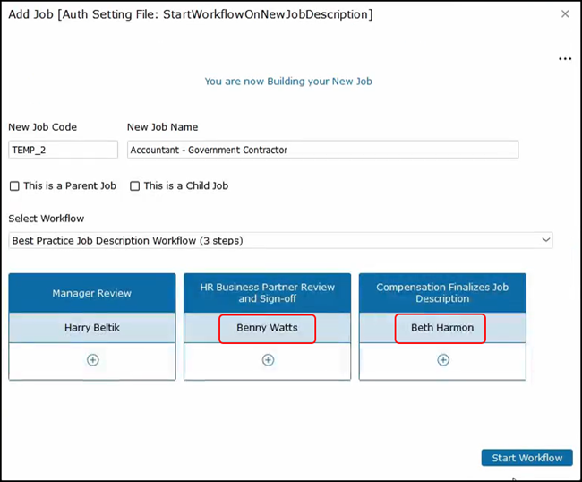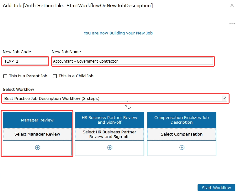 From here you can type in your new job code if you would like and you can adjust the new job name to whatever you'd like it to be. Then you need to select our workflow. Click on the drop-down. For this example, we are going to use our best practice job description workflow with three steps. From here we need to assign our manager to review it.