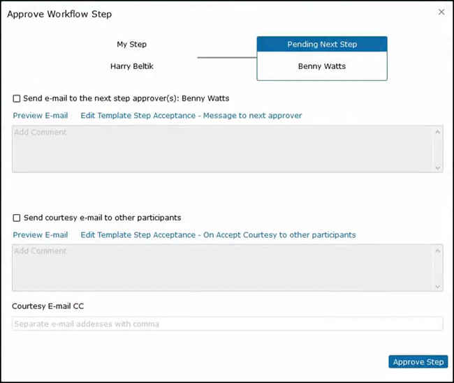 It shows that the next step in the process would be to send this to Benny Watts. He can select send an email and add a comment; he can also send a courtesy email to all other participants. When Benny logs onto the system, he will see that he has a task assigned to him to review the government contractor job description.