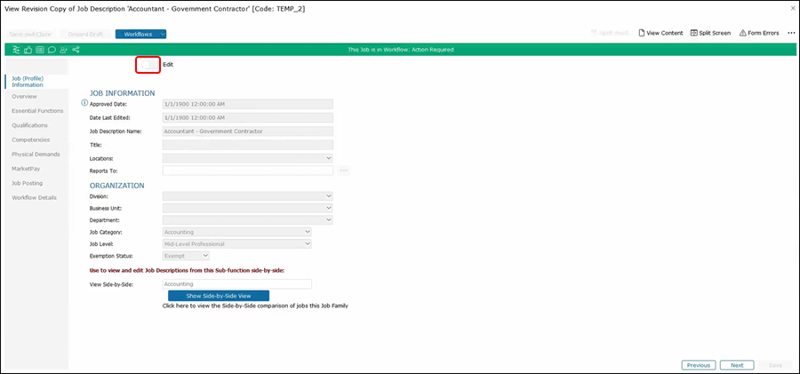 Now that the job is open for review, Harry needs to go in and click Edit and begin editing the job description.
