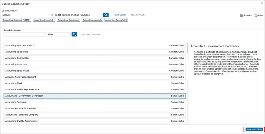 As you can see, we have a bunch of company jobs, simple jobs and job postings. Let's elect a government contractor as our base job like on Save and Close..