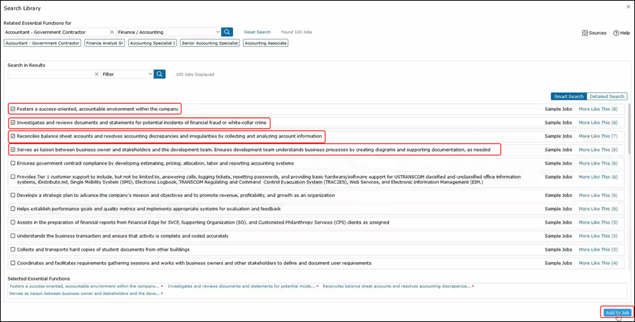 Click Add to Job to add them to the list of essential functions.