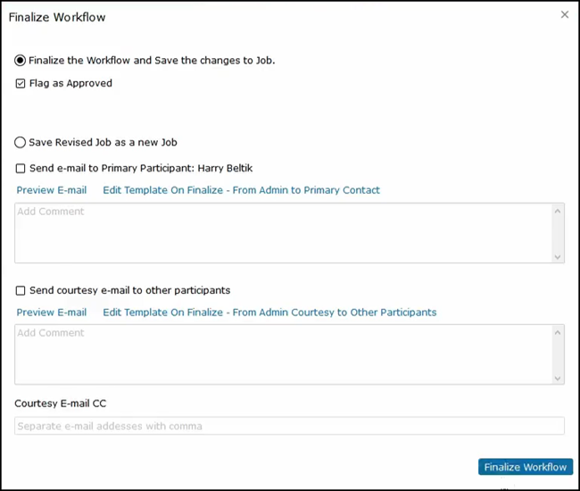 When clicking on Finalize Workflow, a dialog box will pop up confirming that this job has been saved.