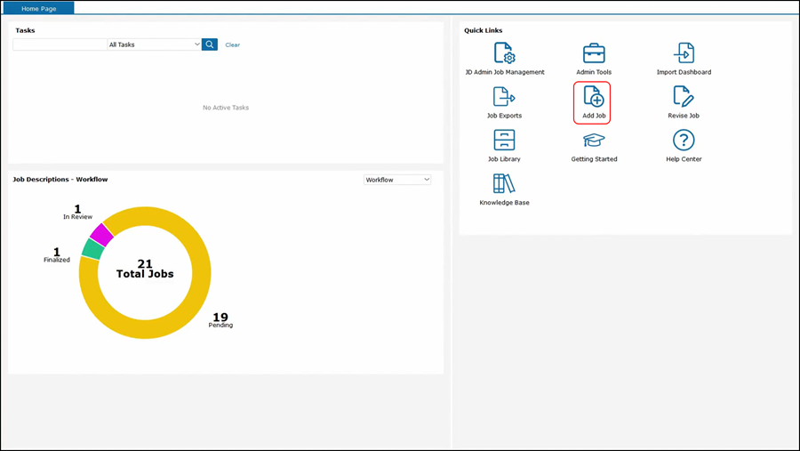 Here we are going to add a new job to the system and kick off our best practice workflow. To add a new job to the system we need to click on Add Job. Keep in mind that your "add job" node may be in a different place is the system is configurable.