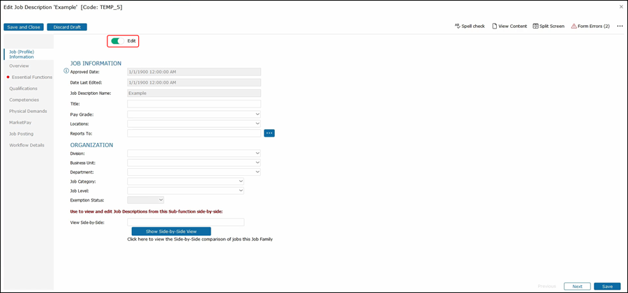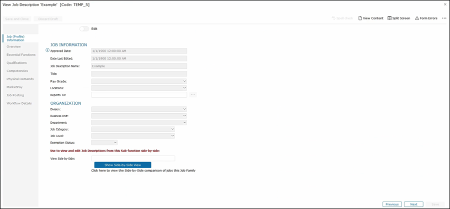To fill this out you would click on edit and fill in each block with information for your blank job description.