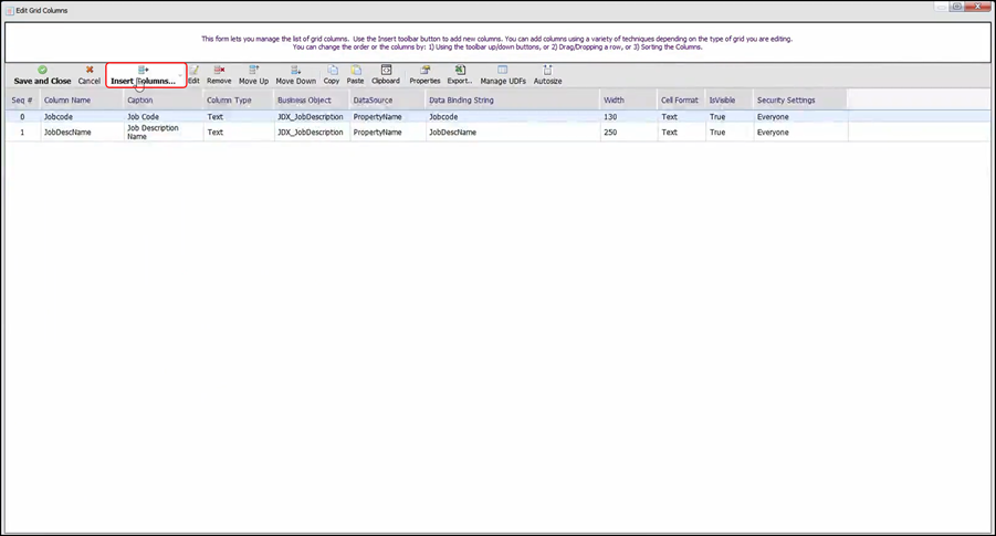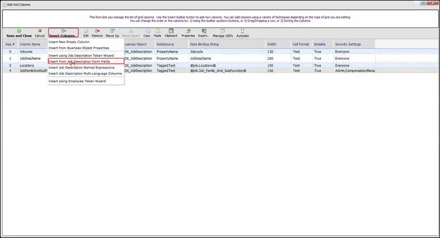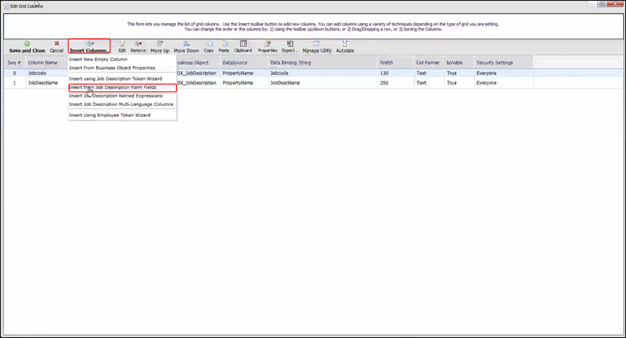 The quickest and simplest way to insert additional columns is to choose Insert From Job Description Form Fields.