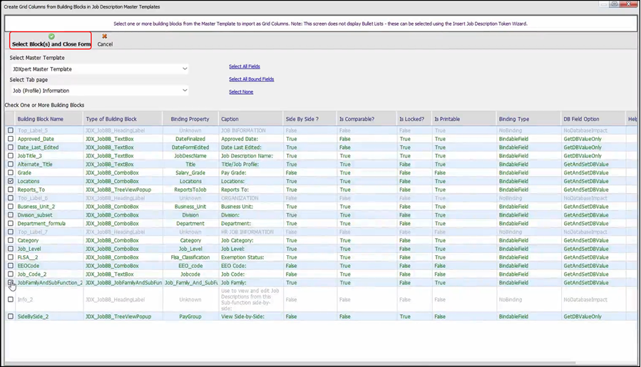 For the Job (Profile) Information, you can export the location, the job family and sub function. We will select those blocks and close the form.