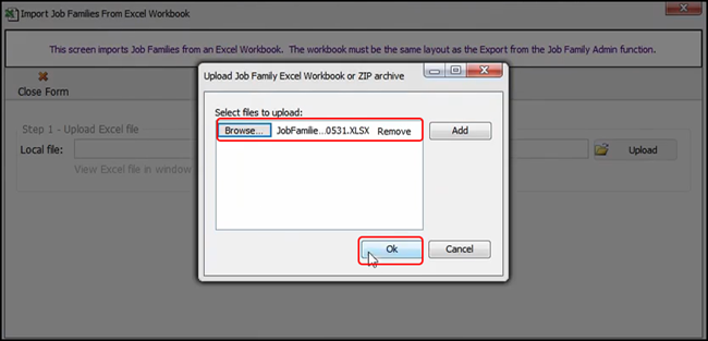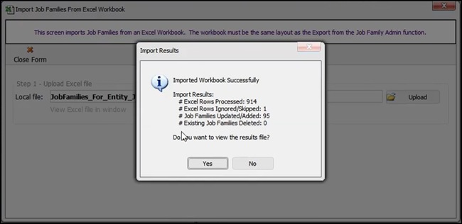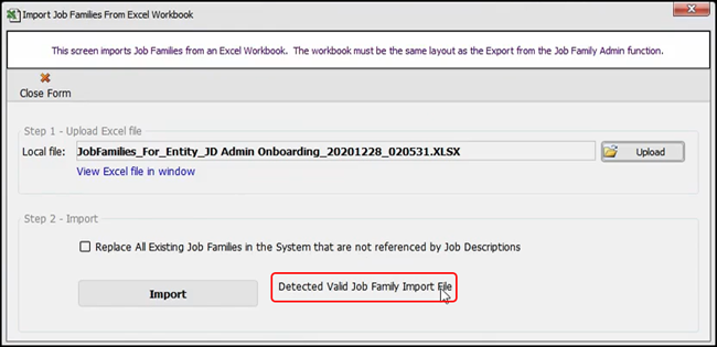 Once you've done so, click on okay. It says it has detected a valid job family import file.