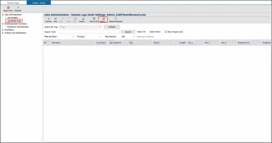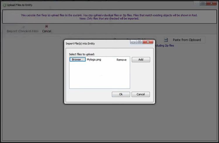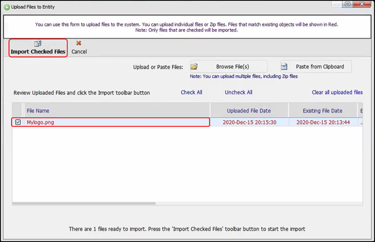 When you see MyLogo.png, click OK. Your file will be highlighted in red, because this is overwriting the existing file already in JDX. This is the recommended behavior. You will want to replace the MyLogo.png that is already in the system and then click on Import Checked Files.