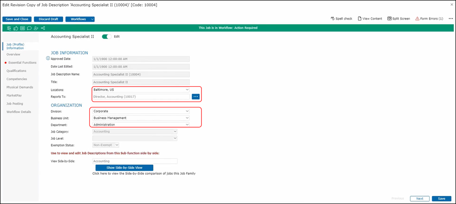 This is because in Harry's role as a manager, he only has access to certain fields. In this case, here he can see these fields but does not have the ability to edit them. The ones in white, however, do allow for editing. To begin editing this job description, he can go ahead and choose the location, He can also choose which job this job reports to. He can continue and choose the division, business unit, and the department.