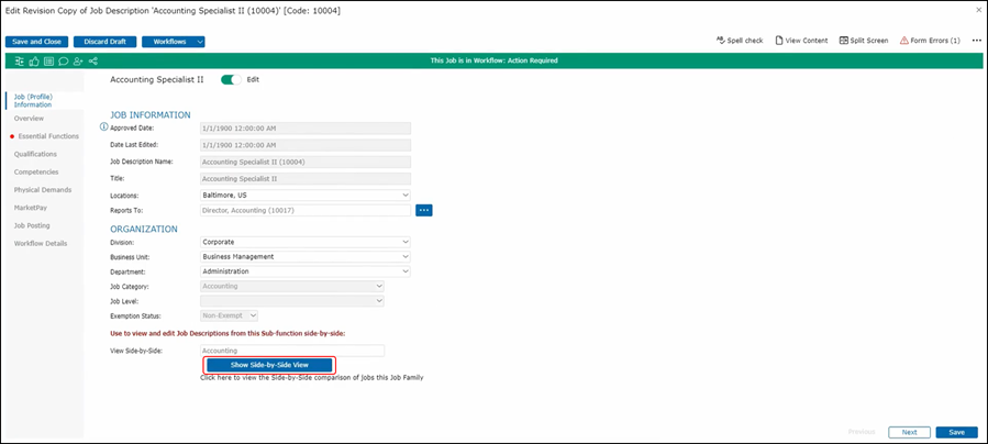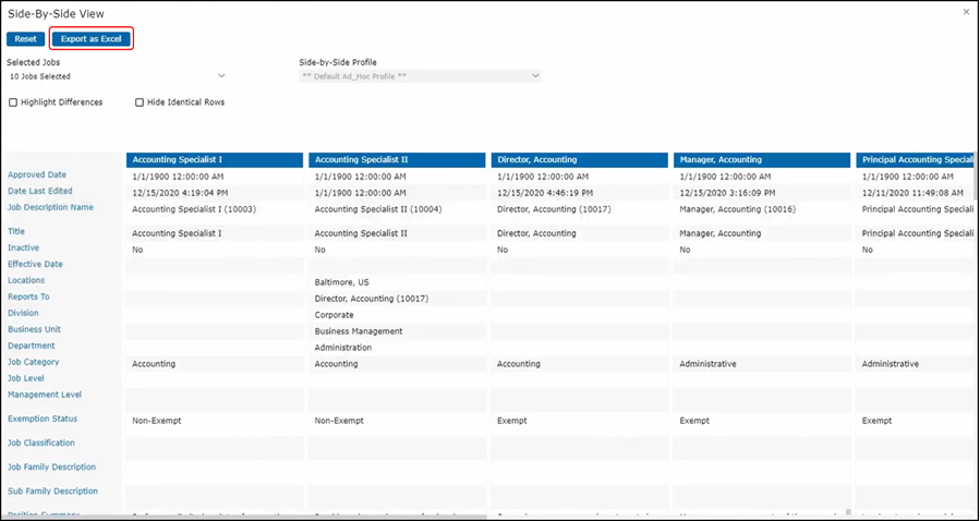 By clicking View Side-by-Side, he has the ability to look at the job description in the side-by-side view. This will compare this job to other jobs within the same job sub-family.
