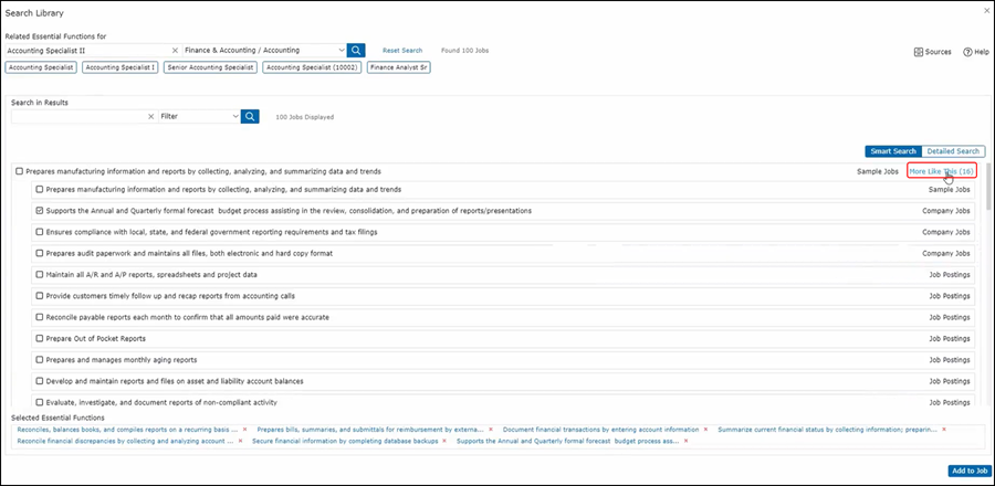 What works differently, however, is that the data comes over in separate rows. The JDX search function creates a Smart Search result for you. This compiles all the top results for that particular job description. To see more details based on a particular grouping click on More Like This and then you'll see additional data that is similar to what the smart search pulled in.
