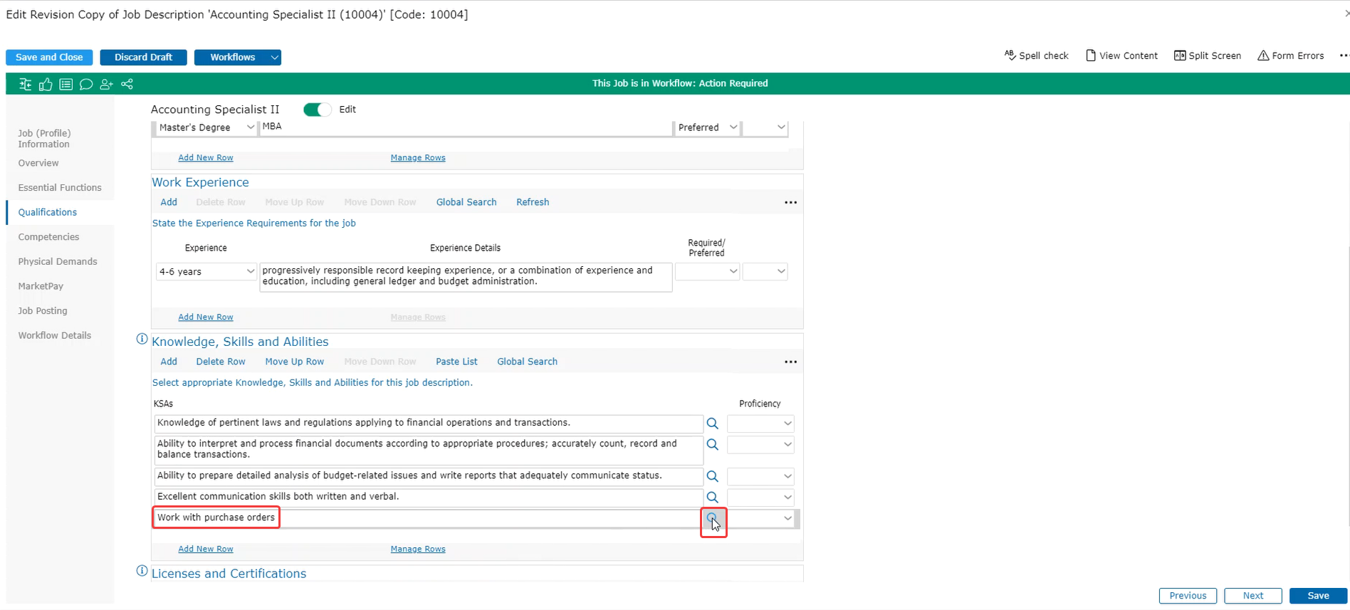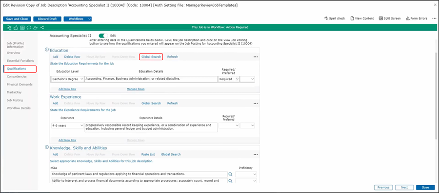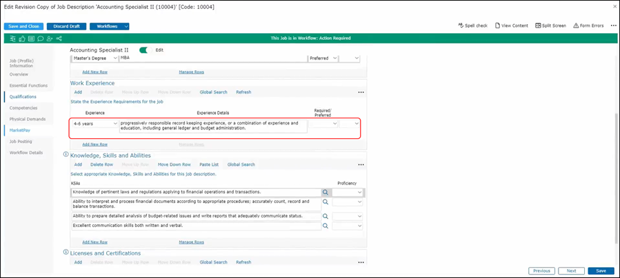 In the Qualifications section, you’ll see Education; Work Experience; Knowledge, Skills and Abilities; and Licenses and Certifications. For Education, an education level has already been selected from the base job that was used as a template. To see where this select fits is in terms of industry standards, click on Search.
