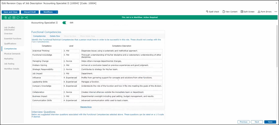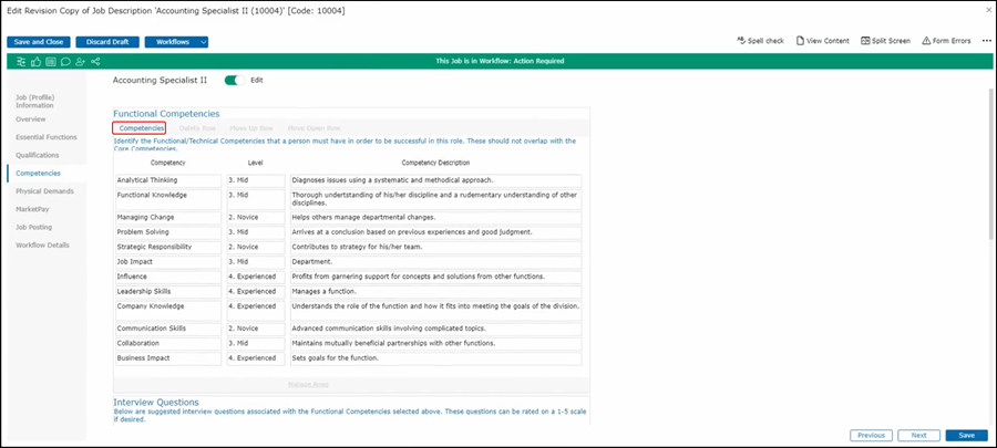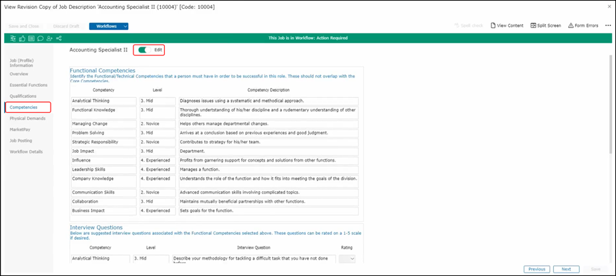 JDXpert provides you with functional and technical competencies. These can help you determine what is this area for a person to be successful in this role. To choose the competencies first make sure your edit button is turned on