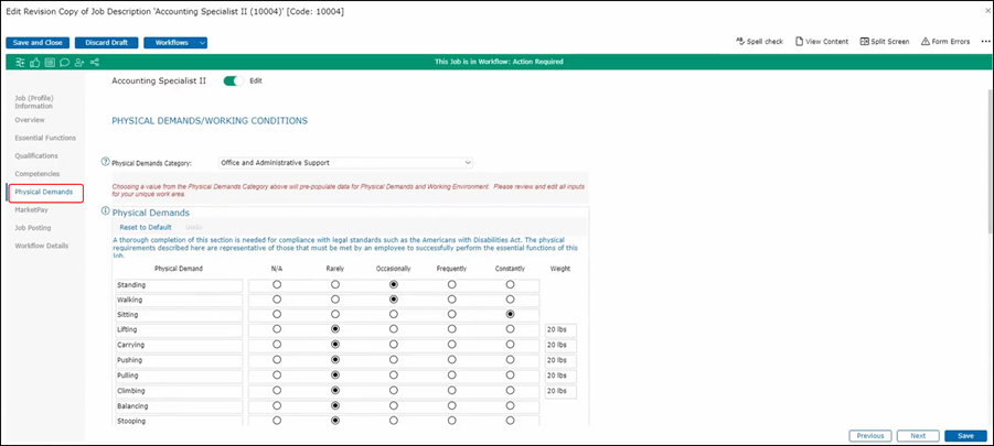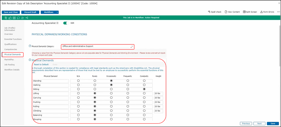 For example, if I click on here, we have health and safety workers with certain physical demands that is typically come into those workers, and going back to the office and administrative the same thing happens here. Of course, I can go into the job description and change it and any of the details that they feel are relevant but this will give them a guideline in terms of what is expected. This functionality has been configured for you for both physical demands and the working environments.